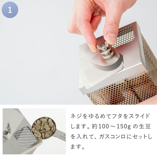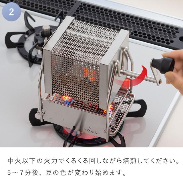 ガス火で自家焙煎!自分好みの味へ、香りを楽しみパチパチと弾ける音を楽しみ出来上がりに感動する。自ら自家焙煎することで、コーヒーをより深く理解できます。同じ豆でも焙煎具合で大きく変わる味をお楽しみください。コーヒー生豆約100〜150gが1回の焙煎目安になります。くるくる手動で回す焙煎器、回し方で焼きムラもできますが、そのムラも個性あるオリジナルの味として楽しめます。注意焙煎中はチャフ(コーヒー皮)が下に落ち散らかります。使用前には周りの物を片付けてからご使用ください。 五徳にしっかり置けることを確認してからご使用ください。五徳小にはご使用できません。 煙が多く出ます。十分に換気できるところでご使用ください。 IH電磁調理器にはご使用できません。