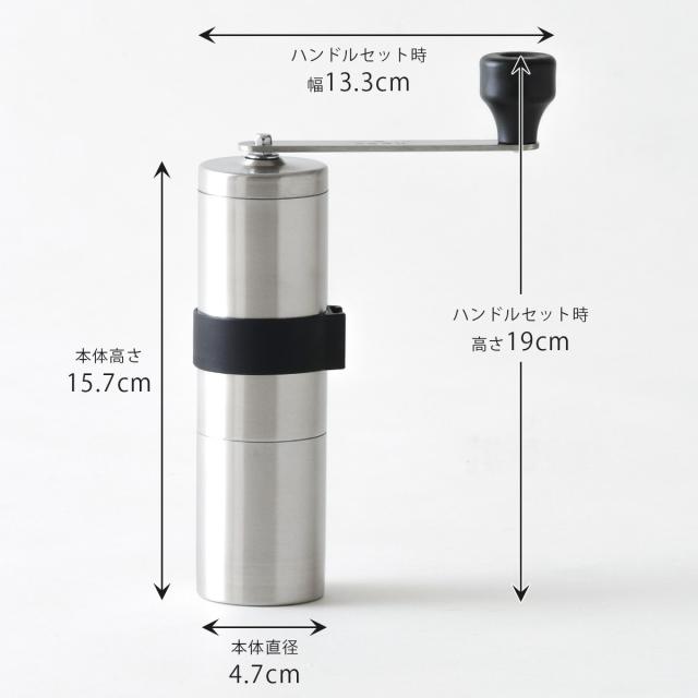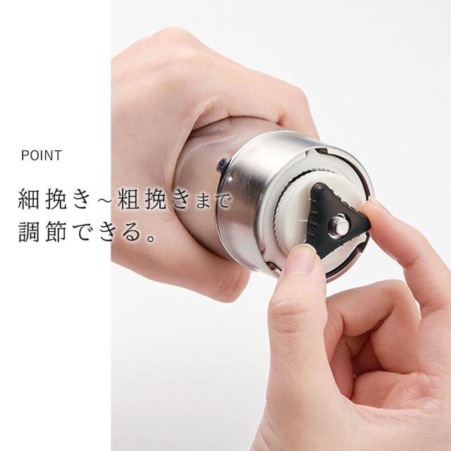 こだわりの一杯を!今までにない挽いた微粉を取り除く機能がプラス!微粉を取り除くことで、雑味のないコーヒーを淹れられます。日本製のセラミックを採用!セラミック刃は回転時でも熱を持ちにくく金属臭もない為、コーヒーの風味を損ないません。摩耗もしにくい為、使い始めの挽き味が持続します。粗さ調整ネジで細挽き〜粗挽きの粉末状態を調整することができます。持ちやすいスリム形状。ステンレス素材の美しいフォルム。