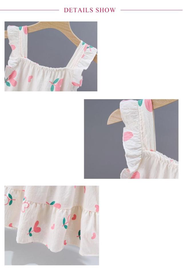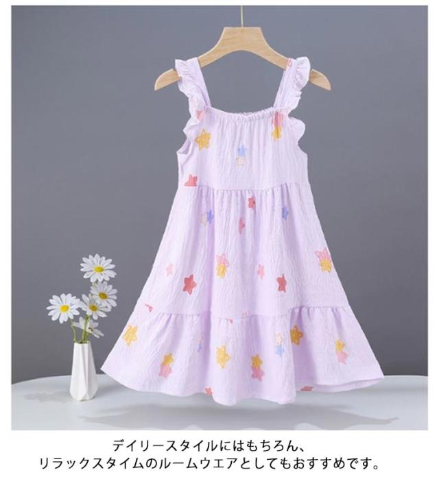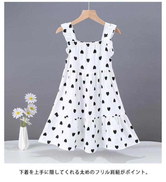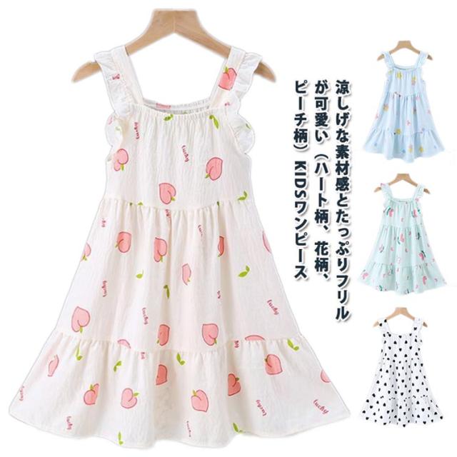 | 涼しげな素材感とたっぷりフリルが可愛い(ハート柄、花柄、ピーチ柄)KIDSワンピース 風合いの良い綿混天竺素材を使用。軽くて柔らかく、優しい肌触りで、リラックスタイムを快適に たっぷりギャザーを施し、ふんわりとしたAラインシルエットにすることで、着心地の良さとエレガントな雰囲気を兼ね備えた一枚に仕上げました。 下着を上手に隠してくれる太めのフリル肩紐がポイント。 キッズならではの可愛らしさと上品さを兼ね備えた、夏におすすめのワンピースです♪ デイリースタイルにはもちろん、リラックスタイムのルームウエアとしてもおすすめです。 | |