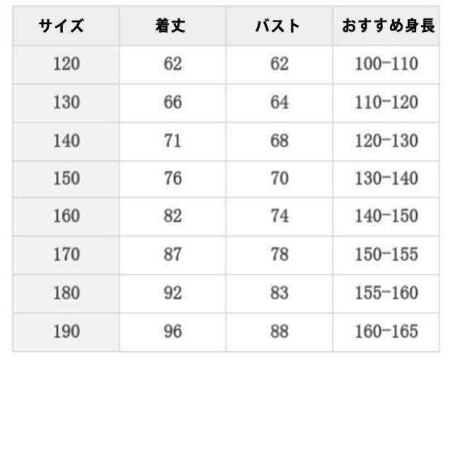 | サイズについての説明 | 120 130 140 150 160 170 180 190 |
