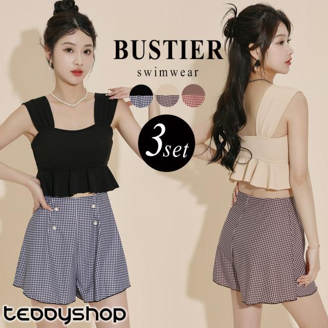 夏新作 水着 レディース ビスチェ ビキニ ショートパンツ 体型カバー 3点セット 20代 30代 40代 ママ水着 セパレート ブラ リブ生地 無地 ギンガムチェック MIXマッチ 幅広肩紐 パール調ボタン ノンワイヤー パッド付き バスト 盛れる ウエスト