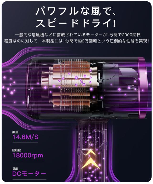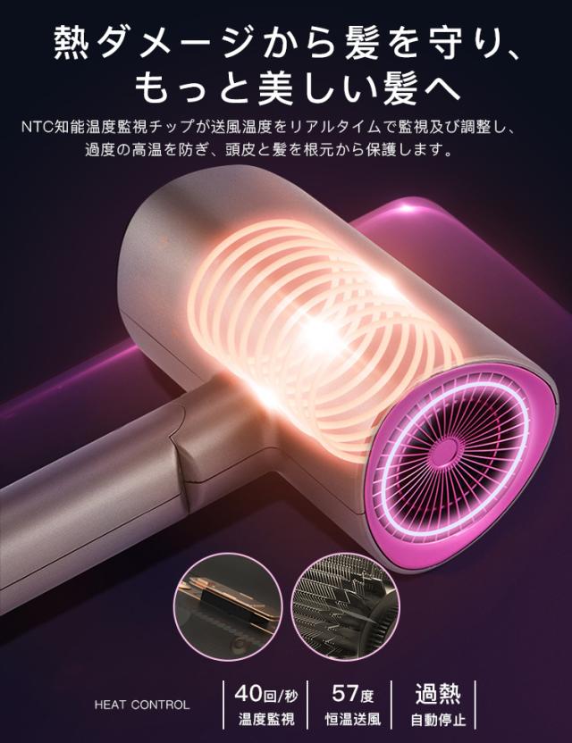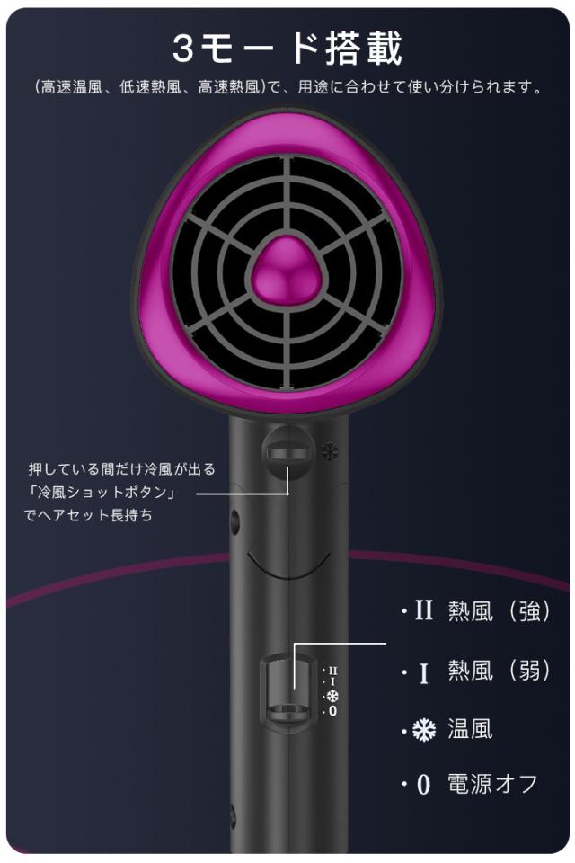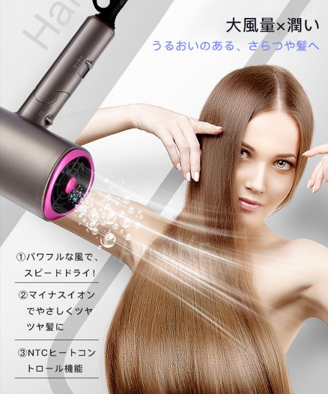- 大風量で髪がすぐ乾くのに、熱すぎず傷みにくいです。マイナスイオン効果で髪もサラサラ!忙しい朝に大助かりです。