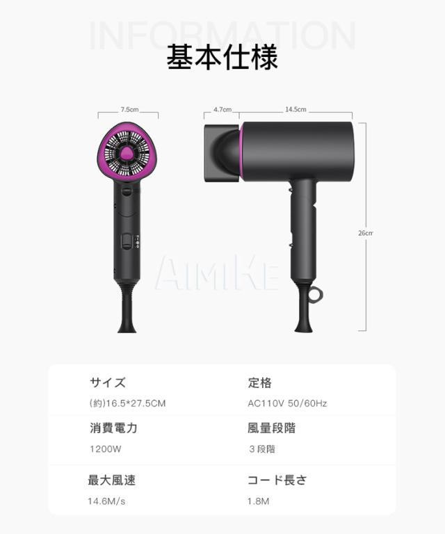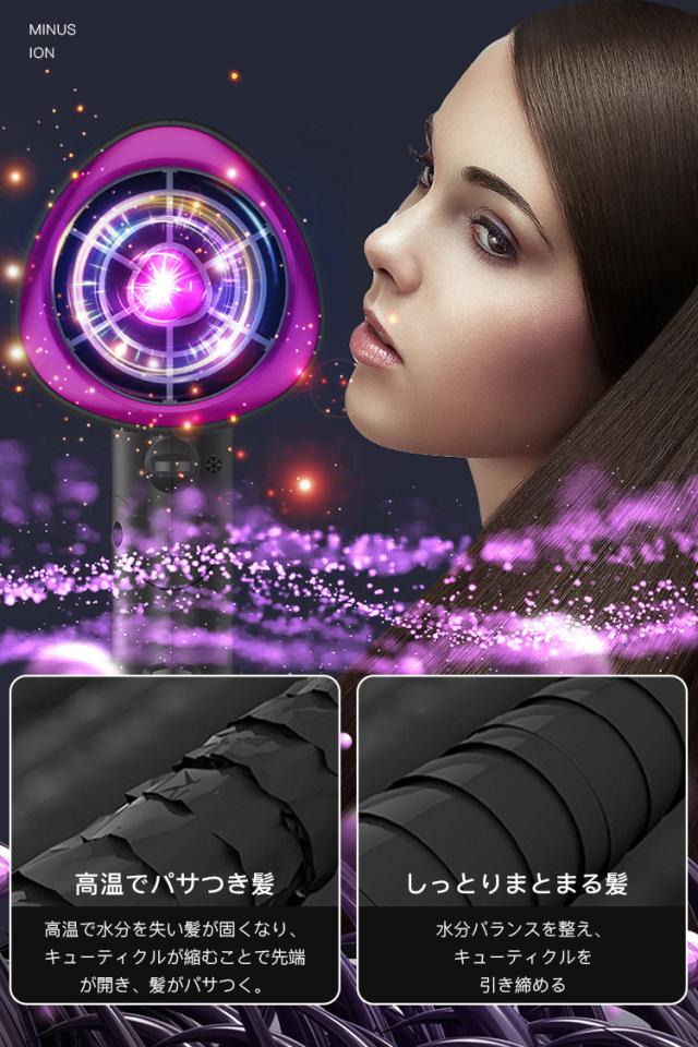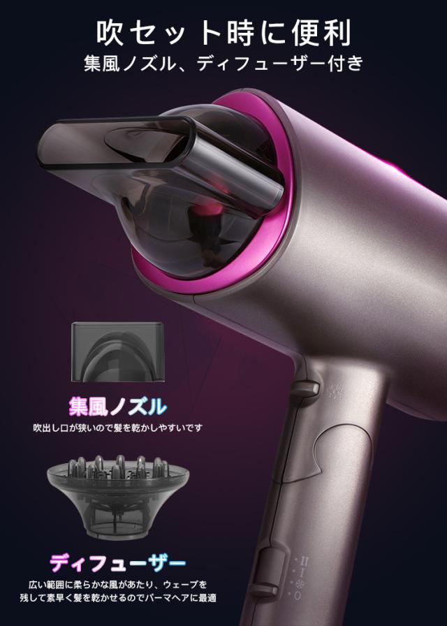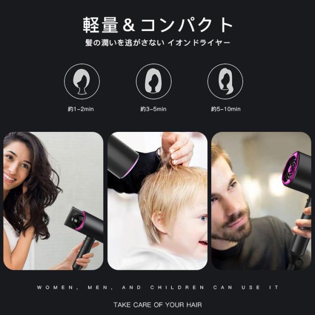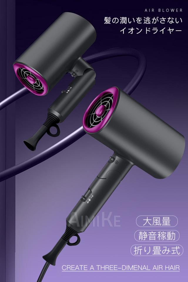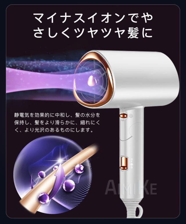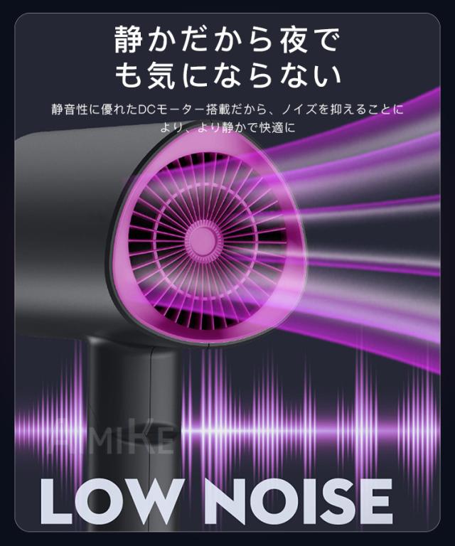 - 髪があっという間に乾きます!音も静かで夜でも気になりません。マイナスイオン効果で髪がさらさらになり、まとまりも良くなりました。折りたためるので旅行にも便利です。