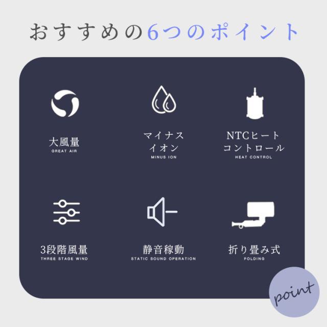 - 髪が早く乾きます。マイナスイオンのおかげか、仕上がりがサラサラになるので毎日使うのが楽しみです。折りたためるので旅行にも持っていきやすくて便利
