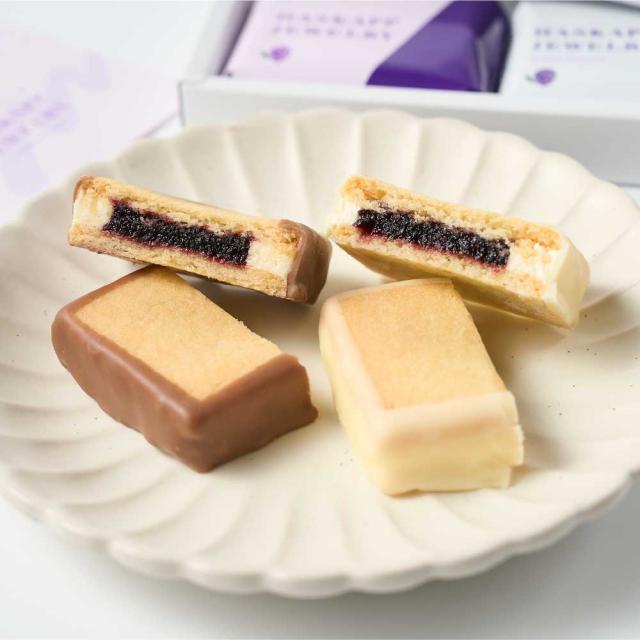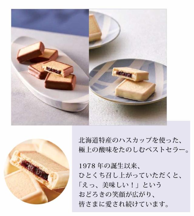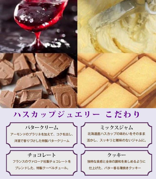 | 原材料名 | 【ハスカップジュエリー】 小麦粉(国内製造)、バター、砂糖、チョコレート、クランベリーピューレ、あんずジャム、液卵、ショートニング、ハスカップ、ココアバター、水あめ、洋酒、アーモンド、食塩/膨張剤、乳化剤、酸味料、ゲル化剤(ペクチン)、香料、酸化防止剤(V.C、V.E)、(一部に小麦・卵・乳成分・アーモンド・大豆・りんごを含む) 【ハスカップジュエリー ホワイトバージョン】 小麦粉(国内製造)、バター、砂糖、チョコレート、クランベリーピューレ、あんずジャム、液卵、ショートニング、ハスカップ、水あめ、ココアバター、洋酒、アーモンド、食塩/膨張剤、乳化剤、酸味料、ゲル化剤(ペクチン)、香料、酸化防止剤(V.C、V.E)、(一部に小麦・卵・乳成分・アーモンド・大豆・りんごを含む) |