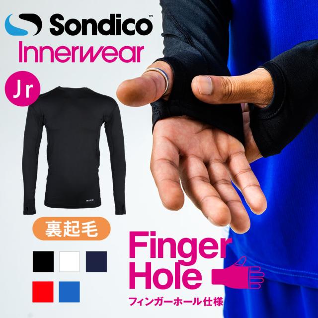 イギリスの伝統あるサッカー専門ブランド・ソンディコのロングスリーブインナーシャツ。丸首仕様。冬でも暖かい起毛タイプ。手の甲で受ける冷たい風を避けながらも指先は自由になる、フィンガーホール仕様。脇下メッシュ構造により衣服内のムレを解消。