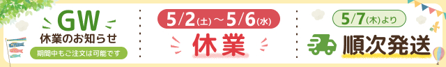 【GW休業のお知らせ】 誠に勝手ながら、5月2日(土)〜5月6日(水)は休業いたします。 期間中にいただいたご注文は、5月7日(木)以降順次発送いたします。