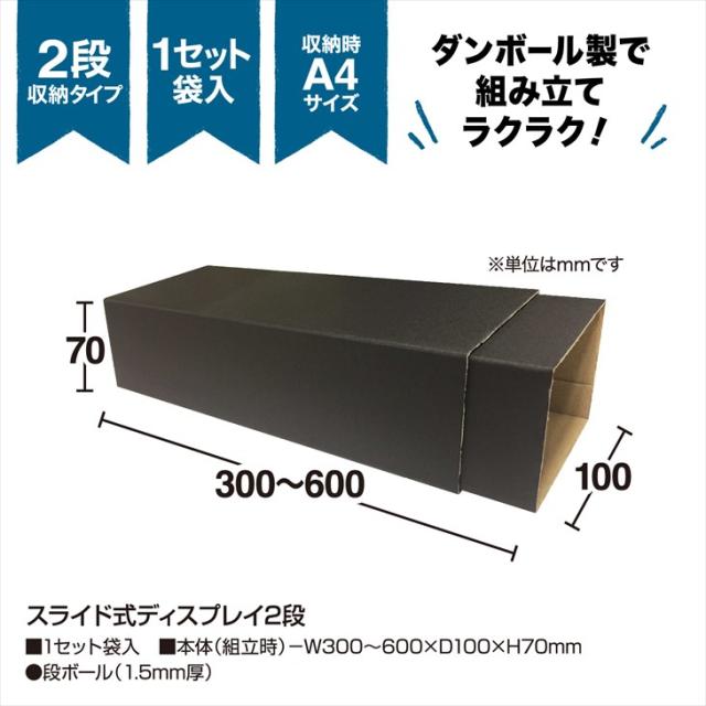 スライド式ディスプレイ 2段 幅30〜60cmまで対応 ブラック 1セット アクセサリー パーツ 販促物 飾り棚 幅調整可能 紙製 組み立て 問屋 飾棚 装飾 収納 販売 SASAGAWA ダンボール ハンドメイド資材 さや工房 手作り アクセサリーパーツ 卸 おすすめ