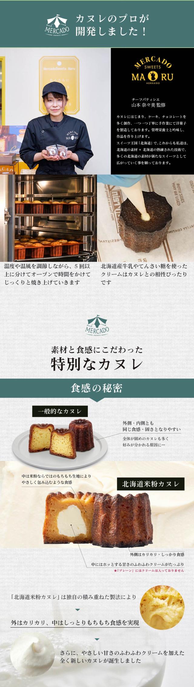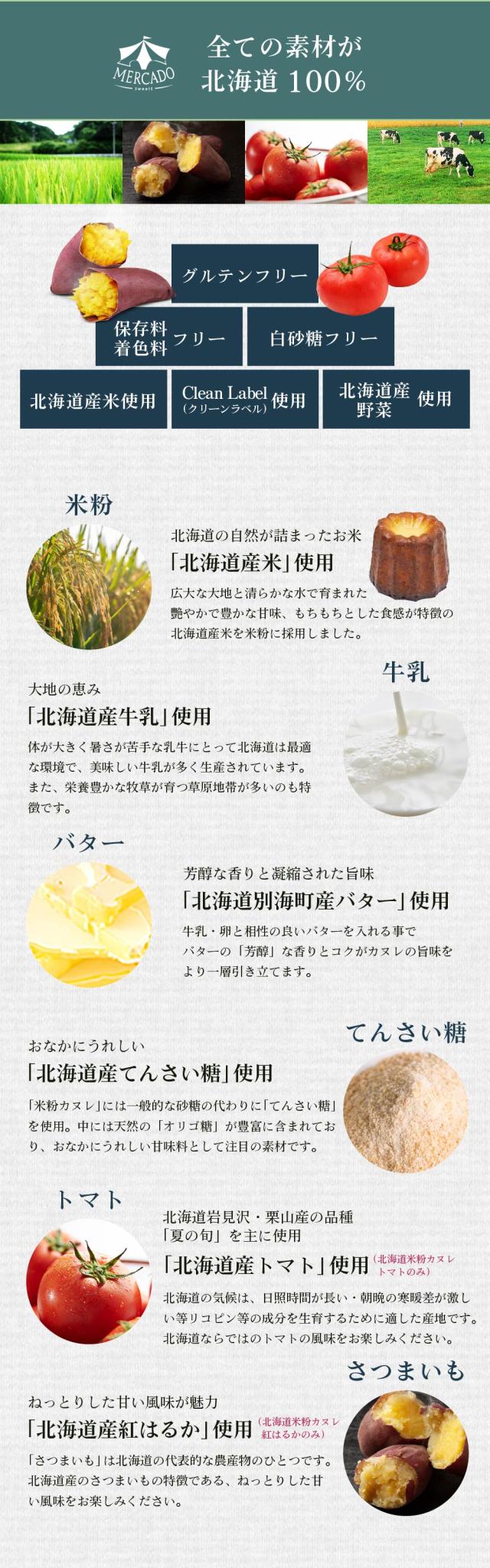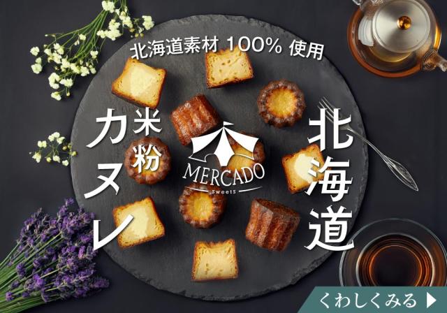 | 商品説明 | 札幌場外市場にあるスイーツ店「メルカードスイーツまる」より、新ブランド「MERCADO」が誕生! 「MERCADO(メルカド)」とは、スペイン語で「市場」という意味。 こちらは、素材から製造・出荷まで、全てを北海道内で行う特別なカヌレになります。 MERCADOのカヌレは、小麦粉を使わないグルテンフリー食品ながらも「二段階熟成技術」により、カヌレ本来のおいしさを実現。 さらに、やさしい甘さのふわふわクリームを加えた、全く新しいカヌレです(※「プレーン」にはクリームが入っていません) グルテンフリーにつき、小麦アレルギーの方にも、安心してお召し上がり頂けます。 小麦粉不使用、ラム酒不使用、保存料等の添加物等も使用しておりません。 甘味には「てんさい糖」を使用して、やさしい甘みに仕上げました。 「トマト」には、北海道岩見沢・栗山産のトマト「夏の旬」を主に使用。 「紅はるか」には、北海道産のさつまいも「紅はるか」を使用しています。 是非とも新ブランド「MERCADO」の特別なカヌレをご賞味ください。 1袋2個入りの専用袋を各種類1袋ずつ合計3袋(6個分)お届けします。 |