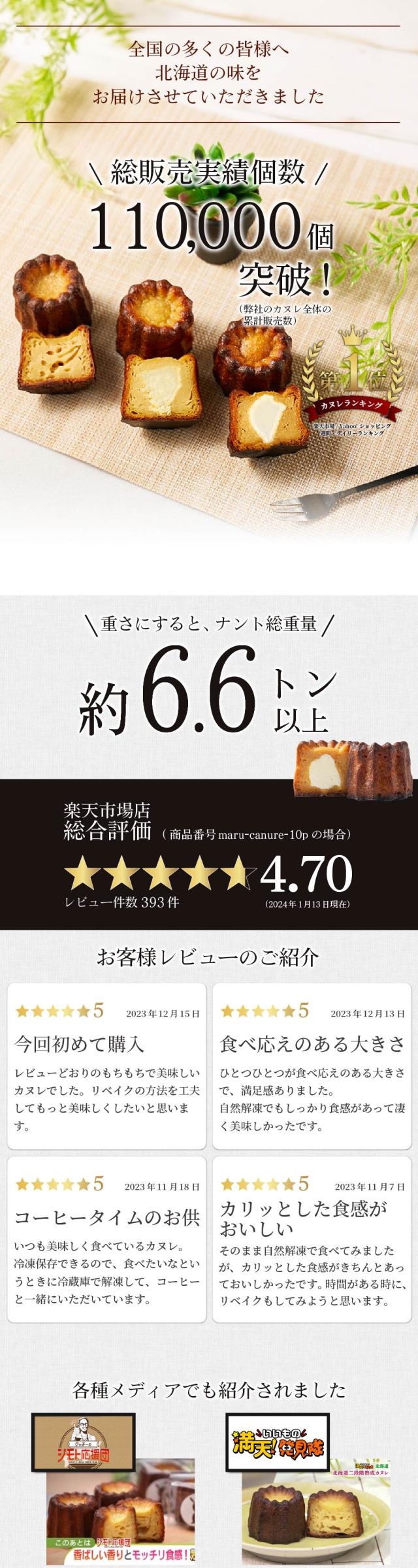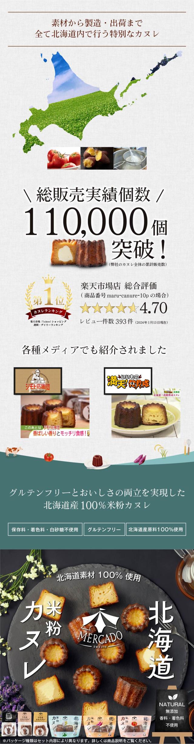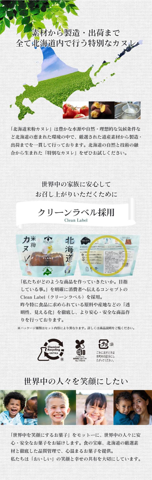 | 商品説明 | 札幌場外市場にあるスイーツ店「メルカードスイーツまる」より、新ブランド「MERCADO」が誕生! 「MERCADO(メルカド)」とは、スペイン語で「市場」という意味。 こちらは、素材から製造・出荷まで、全てを北海道内で行う特別なカヌレになります。 MERCADOのカヌレは、小麦粉を使わないグルテンフリー食品ながらも「二段階熟成技術」により、カヌレ本来のおいしさを実現。 さらに、やさしい甘さのふわふわクリームを加えた、全く新しいカヌレです(※「プレーン」にはクリームが入っていません) グルテンフリーにつき、小麦アレルギーの方にも、安心してお召し上がり頂けます。 小麦粉不使用、ラム酒不使用、保存料等の添加物等も使用しておりません。 甘味には「てんさい糖」を使用して、やさしい甘みに仕上げました。 「トマト」には、北海道岩見沢・栗山産のトマト「夏の旬」を主に使用。 「紅はるか」には、北海道産のさつまいも「紅はるか」を使用しています。 是非とも新ブランド「MERCADO」の特別なカヌレをご賞味ください。 1袋2個入りの専用袋を各種類1袋ずつ合計3袋(6個分)お届けします。 |