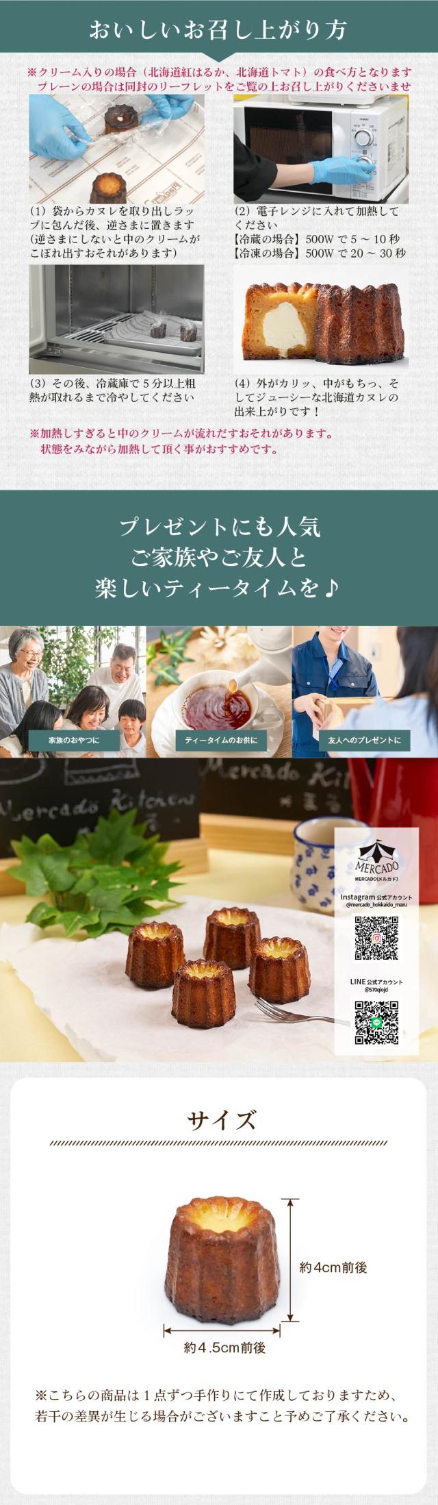 | 内容量 | 北海道 米粉のカヌレ3種類(プレーン・北海道紅はるか・北海道トマト) × 各1袋(2個)セット(合計6個・専用袋入り) |