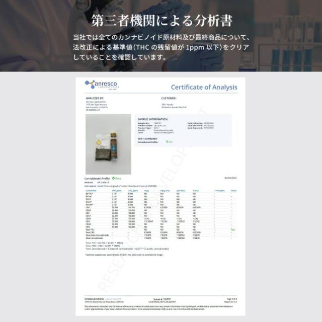 | 新基準適合 | 2024年12月12日施行された「大麻取締法及び麻薬及び向精神薬取締法の一部を改正する法律」により、CBD製品に含まれるTHCの残留値に新たな基準値が設けられました。現在、当社から販売しているすべてのカンナビノイド製品に関しましては、原材料の受け入れから最終製品の完成までに複数回の第三者機関による品質検査を実施しており、新基準値に適合していることを確認しております。これまで通り、高い品質の製品をお届けしてまいりますので、安心してご使用ください。 |