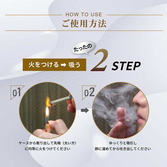 | ご使用方法 | ガラス瓶から取り出して先端のねじっている部分を焼き切り、均等に火をつけてください。※火が付いていないようならタバコの様に吸いながら火をつけてください。 ゆっくりと吸引し、肺に溜めてから吐き出してください。 火が付いたままでもケースに入れ蓋を閉めると、火が消え持ち運びが可能となり数回に分けて使用できます。 |