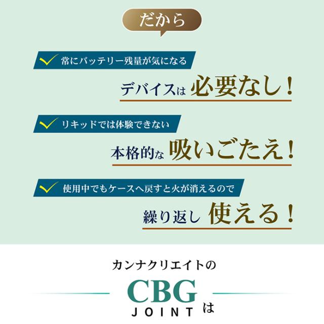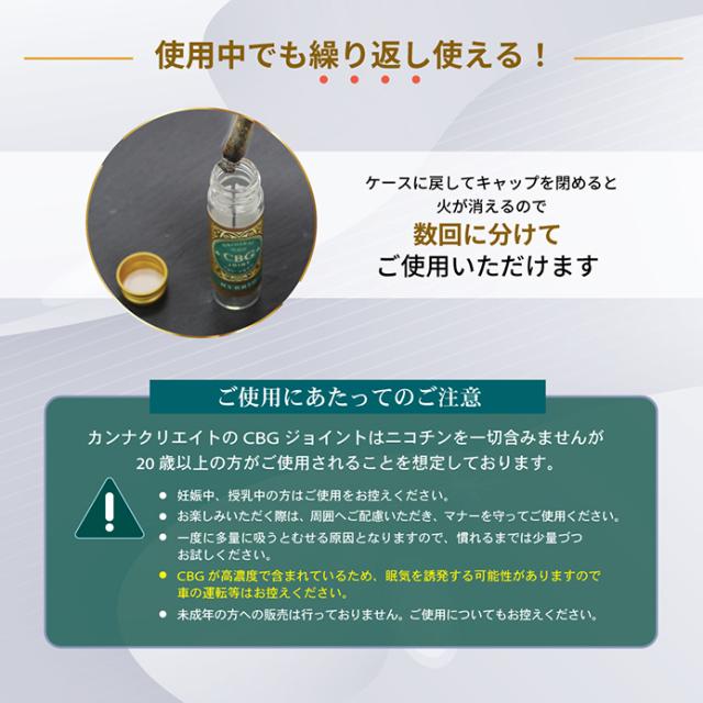| ご使用上の注意 | ●カンナクリエイトのCBGジョイントはニコチンを一切含みませんが、20歳以上の方がご使用されることを想定しております。 ●妊娠中、授乳中の方はご使用をお控えください。 ●お楽しみいただく際は、周囲へご配慮いただき、マナーを守ってご使用ください。 ●一度に多量に吸うとむせる原因となりますので、慣れるまでは少量ずつお試しください。 ●未成年の方への販売は行っておりません。ご使用についてもお控えください。 ●子どもの手の届かないところに保管してください。 |