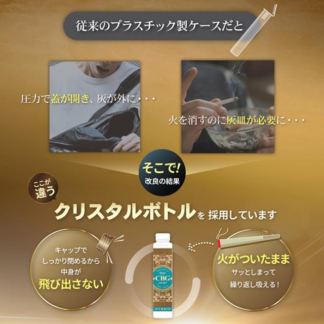 | 特徴 | 【手軽さと高級感のあるケース】 専用のデバイスを必要としないCBGジョイントです。届いたら火をつけてすぐに吸うことができます。 機能性、見た目にもこだわった高級感のあるガラス瓶で、贅沢な時間を演出します。 【圧倒的な吸いごたえ】 ワックスやリキッドでは感じられない、強いキック感とダイレクトに届く煙が贅沢なChill time(リラックスタイム)を演出してくれます。 【吸いきらなくてもOK】 濃厚な吸いごたえで一度に吸いきれないときは、付属のガラス瓶に入れしっかりと蓋を閉めることで鎮火し、再度火をつけることで吸いきるまで繰り返し楽しめます。 |