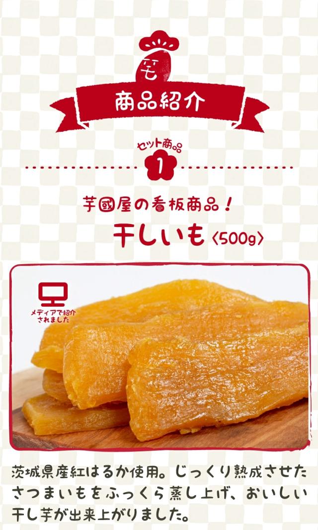 品名 干し芋原材料名 さつまいも(紅はるか)原料原産地名 茨城県ひたちなか市内容量 平干し:500g賞味期限 お届け日から約21日間保存方法 お受け取り後は必ず小分けにして冷蔵または冷凍して下さい。加工者 株式会社 芋國屋千葉県流山市駒木633-4- -品名 芋けんぴ名称 油菓子原材料名 さつまいも(国産)、こめ油、砂糖、塩内容量 45g×3袋賞味期限 ラベルに記載保存方法 直射日光、高温多湿を避けて、保存してください販売者 株式会社 芋國屋千葉県流山市駒木633-4加工者 香取プロセスセンター(株)千葉県香取市福田495- -名称 スプレッド(さつまいも)原材料名 有機安納芋(長崎県五島産)、バター(北海道産)、グラニュー糖、レモン果汁、(一部に乳成分を含む)内容量 140g賞味期限 ラベルに記載保存方法 直射日光及び高温多湿をさけ、常温で保存してください。販売者 (株)アグリコーポレーション長崎県五島列島市三井楽町濱ノ岬2969-3