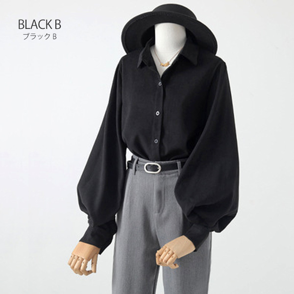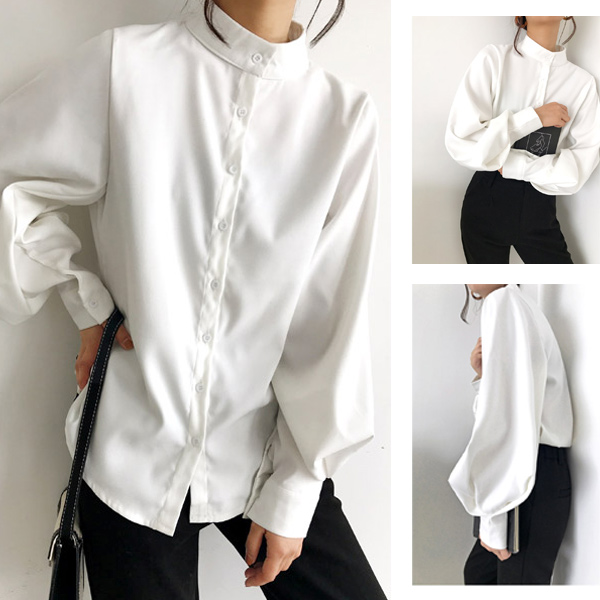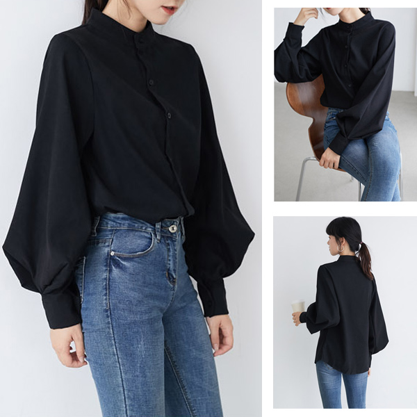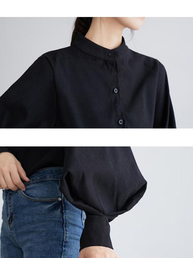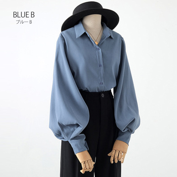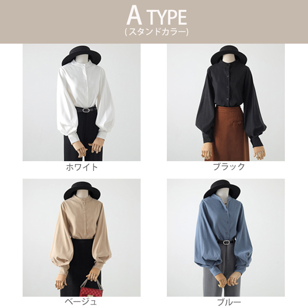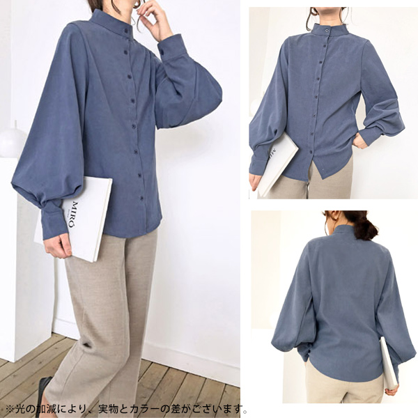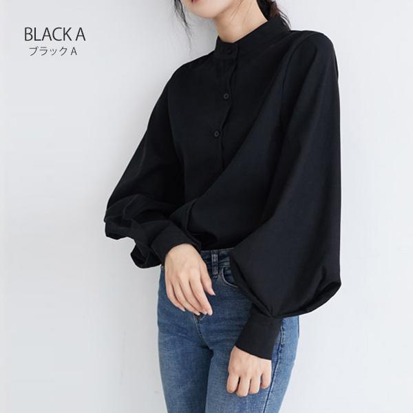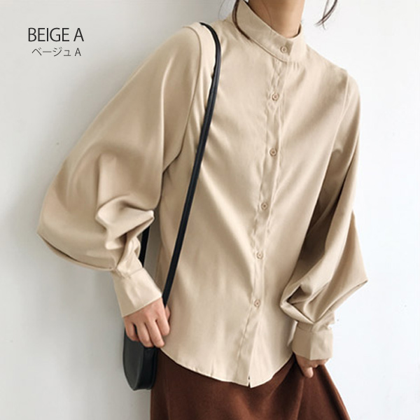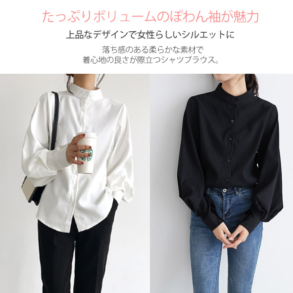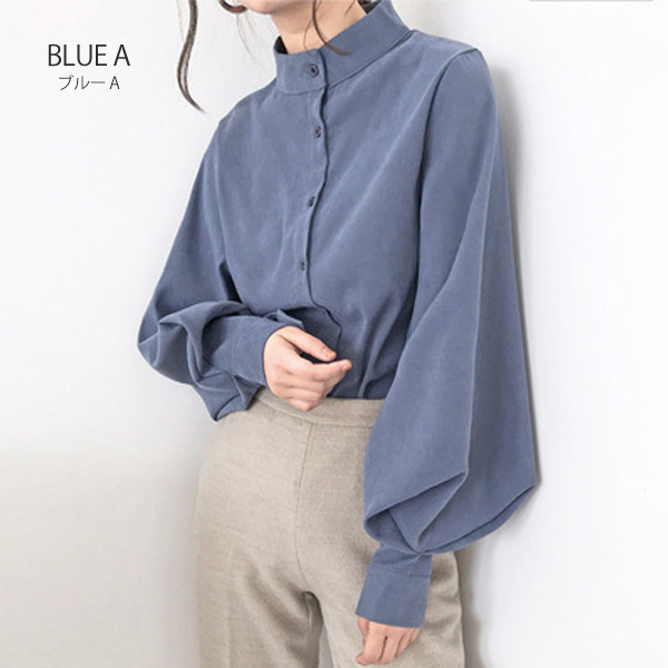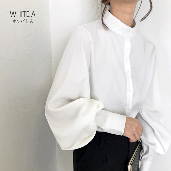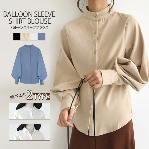 ブラウス シャツ レディース 長袖 無地 ボリューム袖 バルーンスリーブ スタンドカラー 白 黒 ベージュ ブルー 送料無料