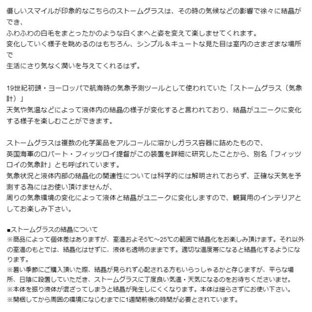 優しいスマイルが印象的なこちらのストームグラスは、その時の気候などの影響で徐々に結晶ができ、