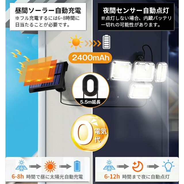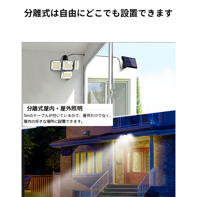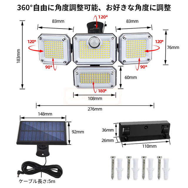 | 特徴 | ◆◆360度角度調整可能、333個のLED電球、4面のパネルでとっても明るいソーラー充電式センサーライト ◆ソーラー充電式なので日中の太陽光で効率よく充電でき節電はもちろん、環境にもやさしく安心です。 ◆4つのパネルはそれぞれ可動し、幅広い範囲をしっかりと照らしてくれます。 ◆防水性、耐熱・耐冷性にも優れているので屋外でも安心してご使用頂けます。 ◆リモコンがついているので高い位置に取り付けても簡単に操作できます。 ◆ソーラーパネル一体型と分離型の2タイプからご家庭の環境にあった製品をお選びいただけます。 |