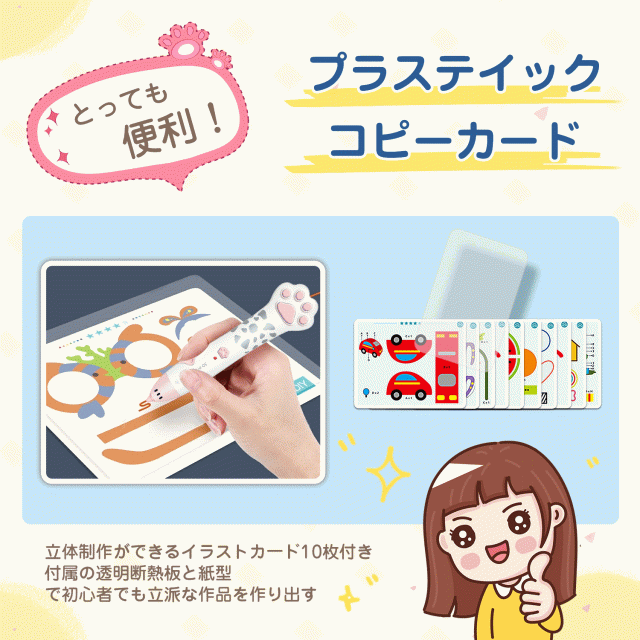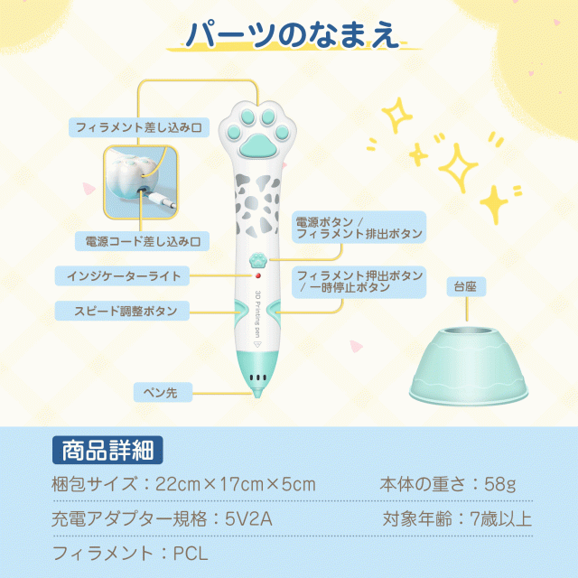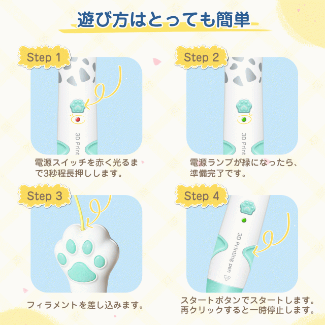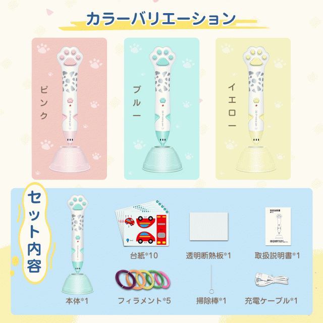 - とても使いやすく、低温タイプなので子どもでも安心して遊べます。 デザインも可愛く、付属のフィラメントや台紙ですぐに作品作りができ、創造力が育つのが嬉しいです。プレゼントにもおすすめです。