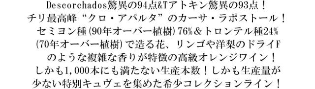 Descorchados驚異の94点&Tアトキン驚異の93点! チリ最高峰“クロ・アパルタ”のカーサ・ラポストール! セミヨン種(90年オーバー植樹)76%&トロンテル種24% (70年オーバー植樹)で造る花、リンゴや洋梨のドライF のような複雑な香りが特徴の高級オレンジワイン! しかも1,000本にも満たない生産本数!しかも生産量が 少ない特別キュヴェを集めた希少コレクションライン!