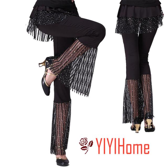ダンスパンツ 美脚パンツ スカート付き フィットネス 社交ダンス ベリーダンス レッスンパンツ ズボン ダンス衣装 pants アラビアン レディース ストレッチ素材 ウエストゴム/裏地なし ブラック 黒 きらきら ベルボトム