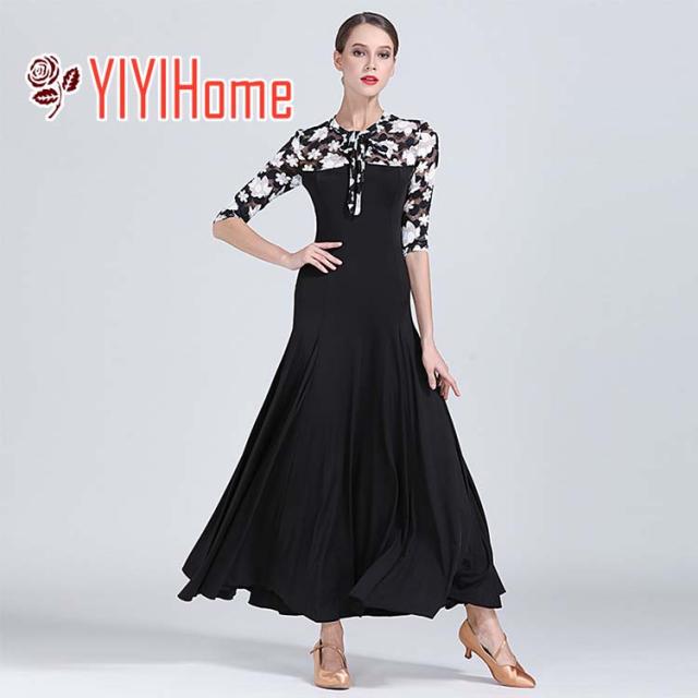 レディース 社交ダンス衣装 モダンドレス レースワンピース キャミソール 長袖 パステルカラー ブラック 上品 華やか キレイ ゴージャス 豪華 高級 大会 競技用 ワルツ ラテンダンス シフォンドレス 大きい裾