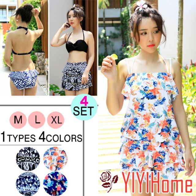 あす楽対応 新作 水着 レディース ビキニ タンキニ 4点セット ブラジャー 下着 ショートパンツ トップス 女性用 大人 セクシー 可愛い 盛れる ワイヤ入り パッド入り 体型カバー 女の子 ママ 1タイプ4カラー エスニック柄 フラワー 花柄