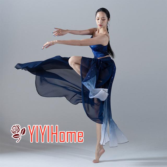 2点セット ダンス衣裳 レディース ベリーダンス チャイナダンス 中国古典舞踊 上下セットアップ キャミソール 巻きスカート 広がる 大きい裾 星空柄 グラデーション 美人 エレガント 普段着 ステージ舞台演出服 練功服 レッスン練習着 S M L XL
