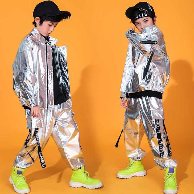 キッズダンス衣装 セットアップ ヒップホップ ダンス衣装 ジャケット パンツ Tシャツ 派手 長袖 ユニセックス ダンス衣装 原宿 キッズ ダンス 衣装 ヒップホップ ガールズ キッズダンス ダンス hiphop jazz ダンス衣装 カッコイイ シルバー 110-180cm