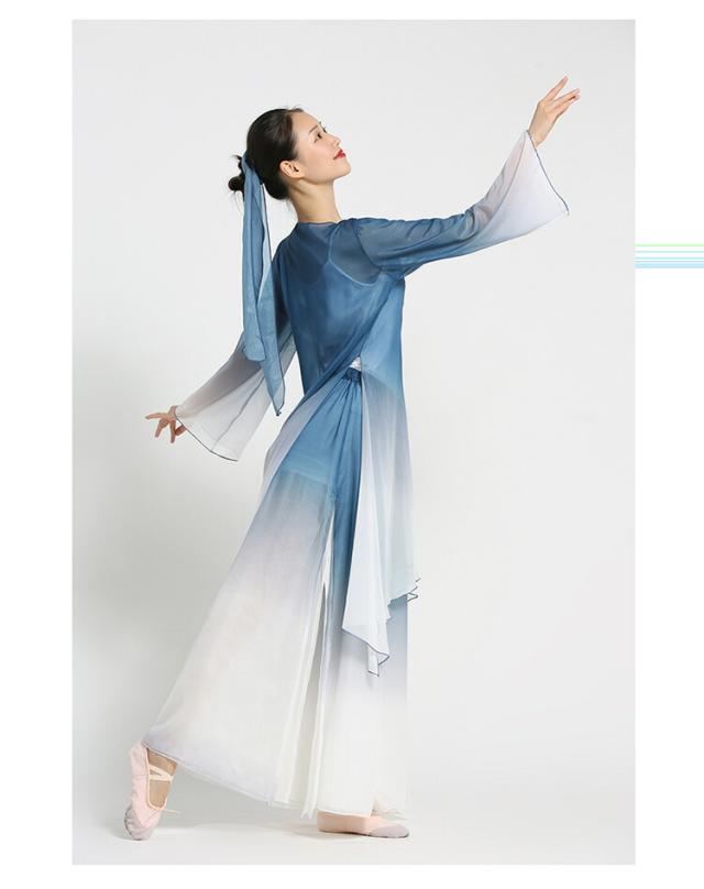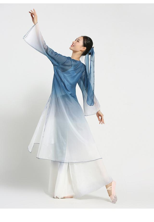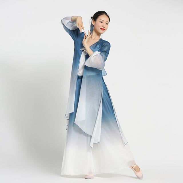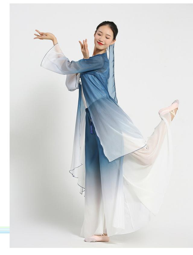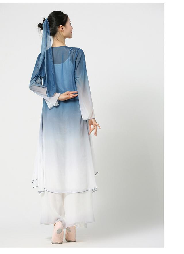 中国古典舞踊ダンスウェア グラデーション ロング丈羽織 長袖 シースルー 前開き ロングブラウス ガウチョパンツ スカーチョ シックな舞台ステージ 演出衣装 チャイナ風民族ダンス衣装 光沢感あり スリット 古典ダンス 練習着 レッスン着 白+紺