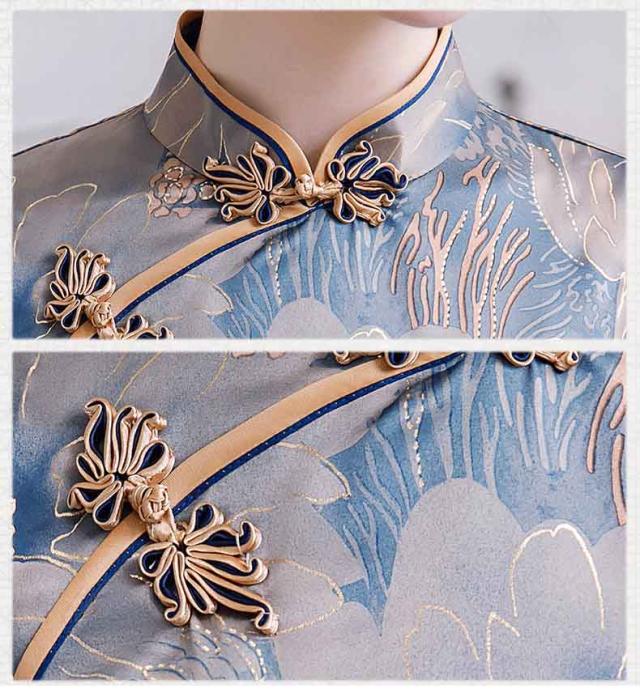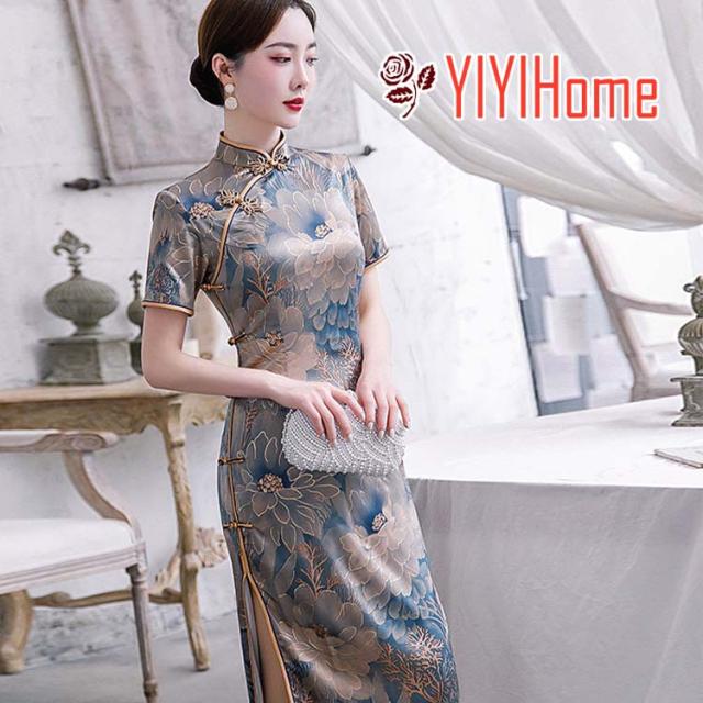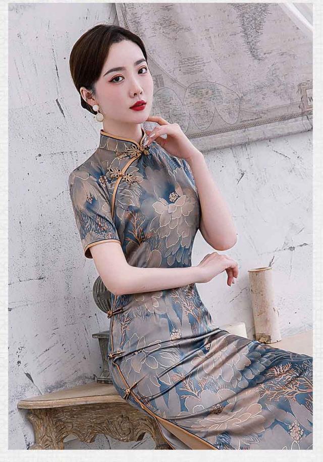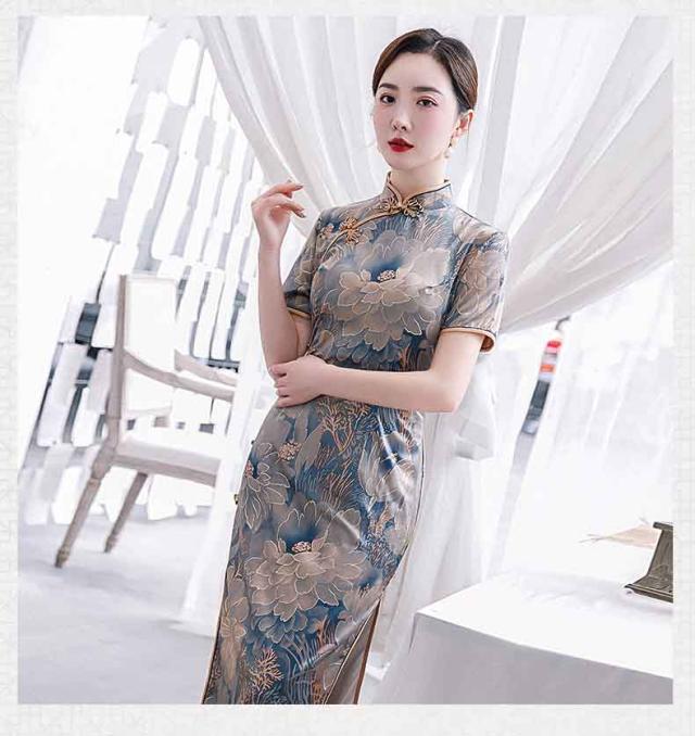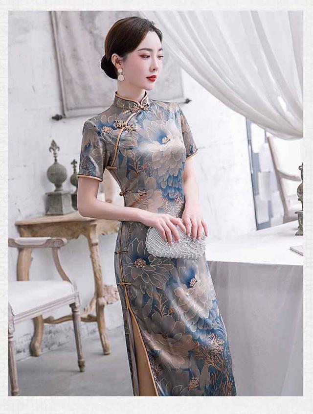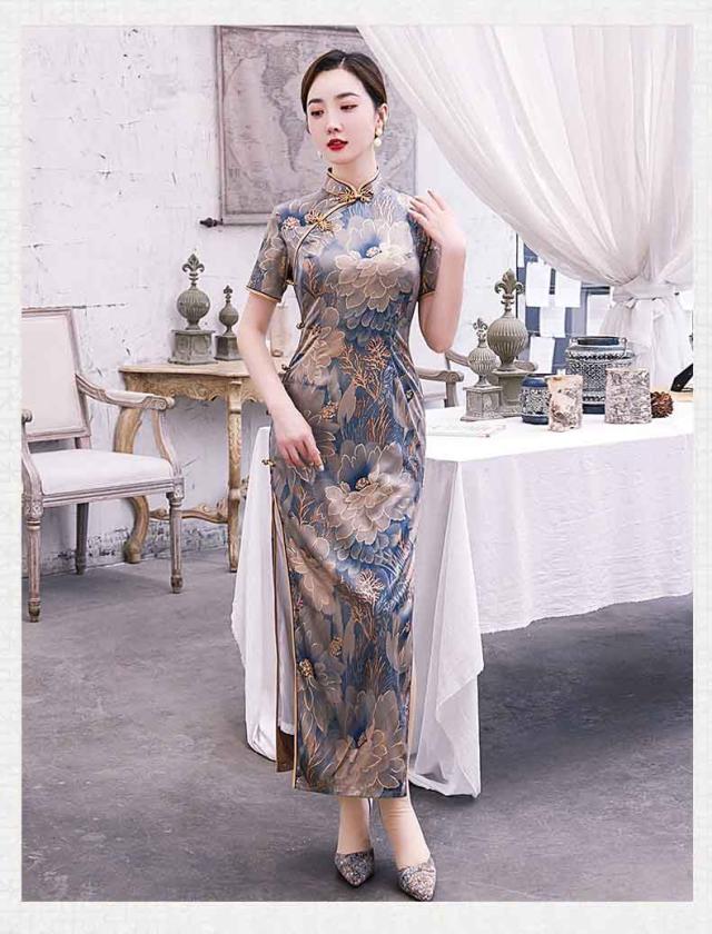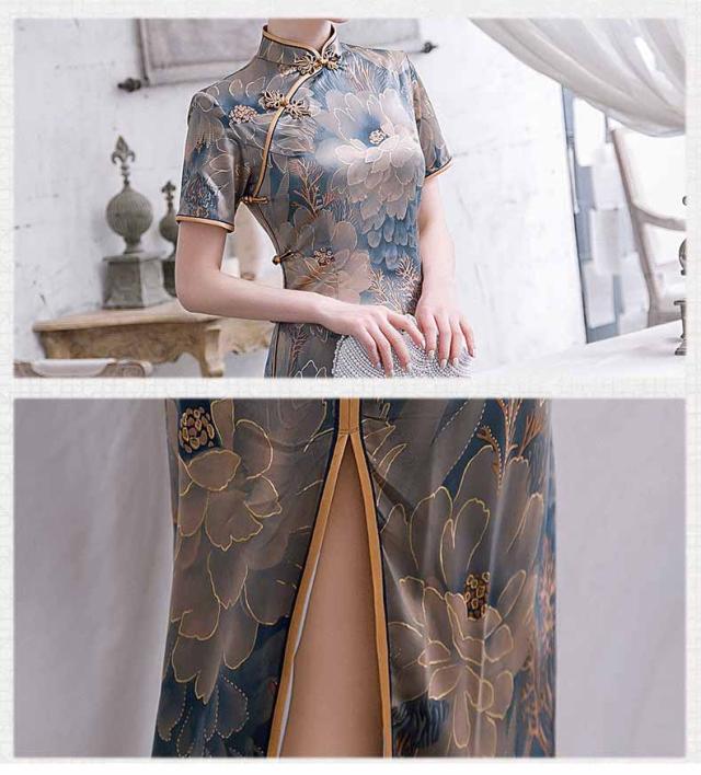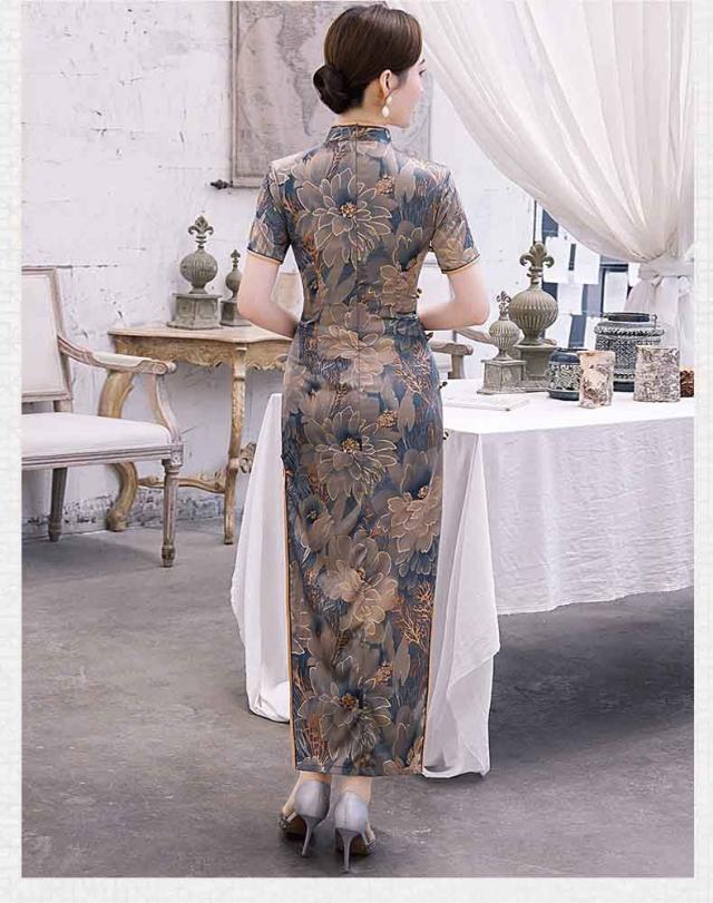 ロング丈チャイナドレス 半袖 ロングチャイナ服 中華服 中華ドレス 穏やかなチャイナワンピース シックな花柄 中国風パーティードレス 演奏服 華流コスプレ 30代 40代 50代 高級 贅沢