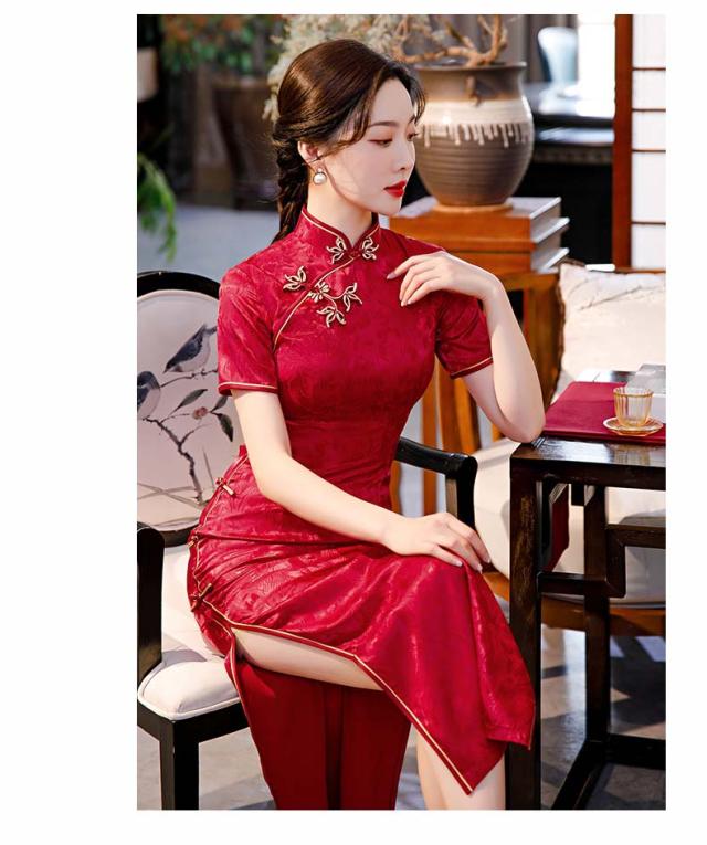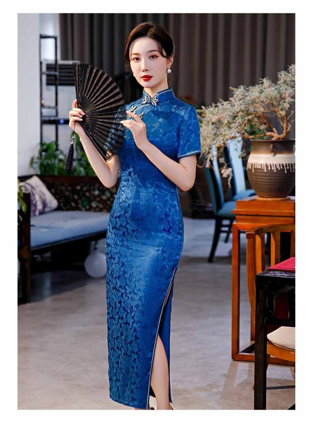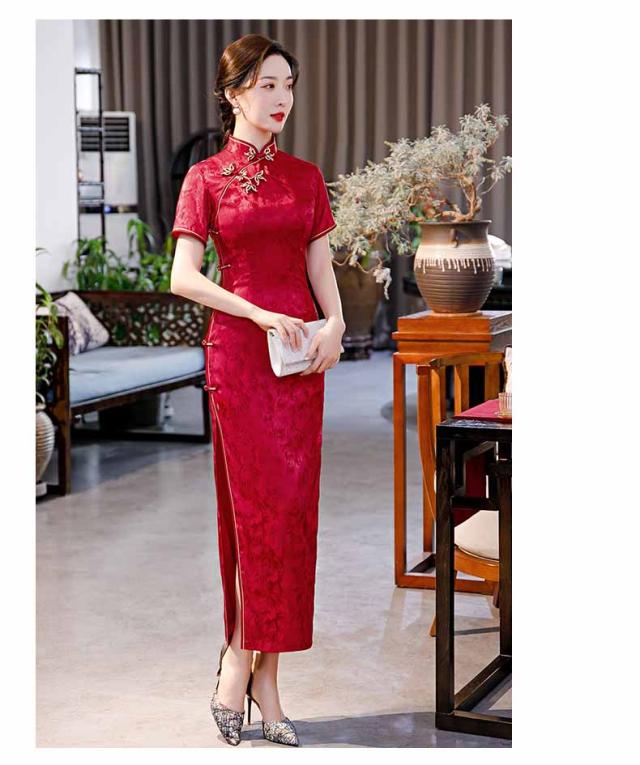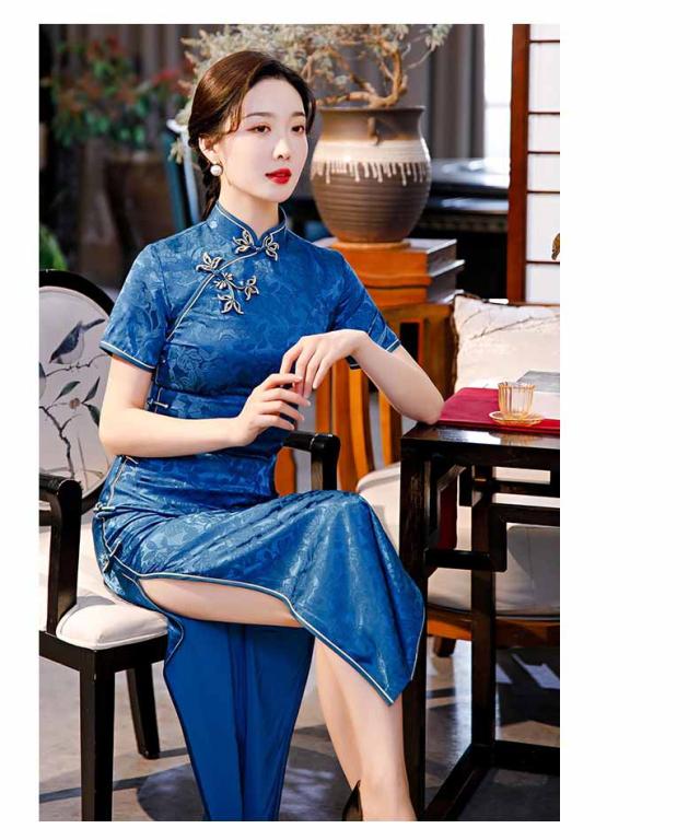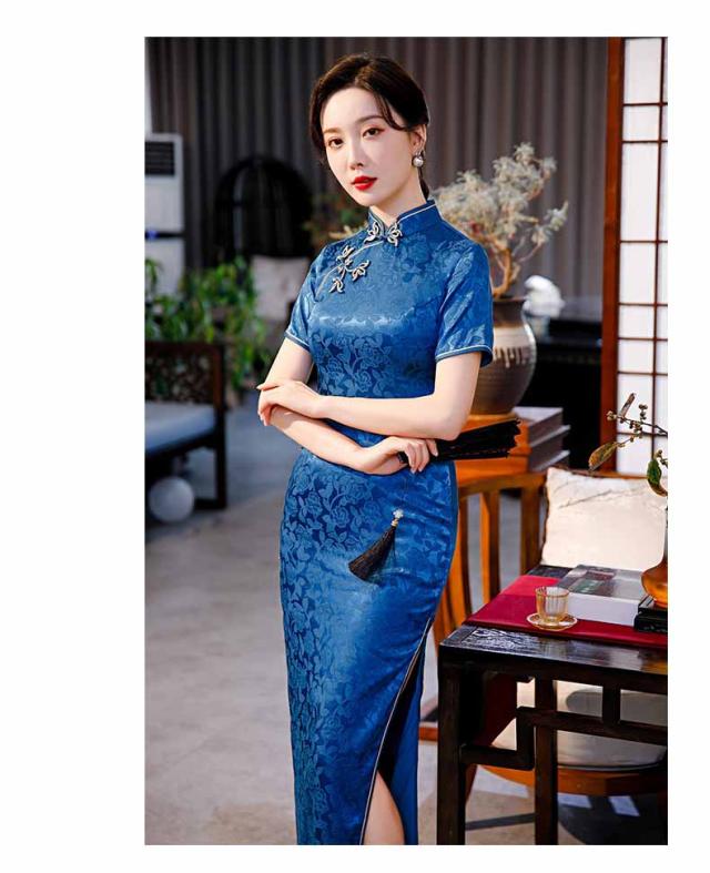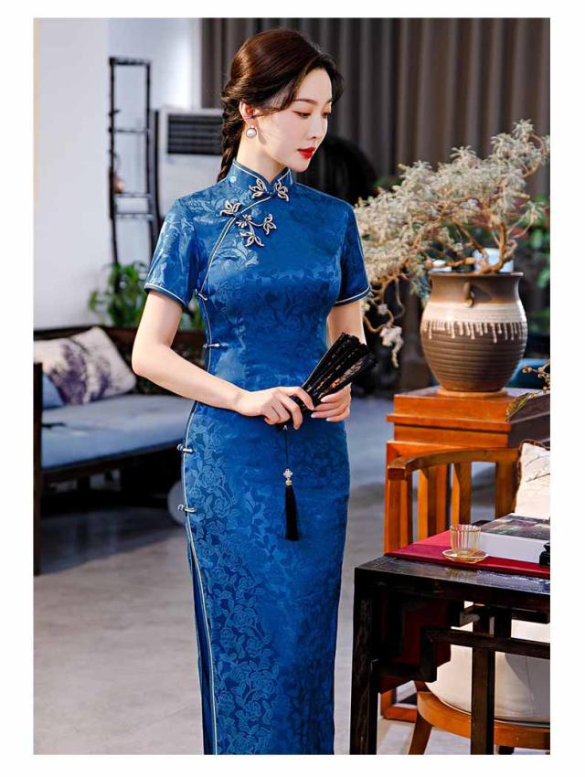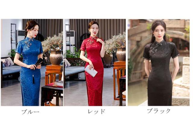 ロング丈チャイナドレス 半袖 ロングチャイナ服 中華服 中華ドレス 穏やかなチャイナワンピース シックな花柄 中国風パーティードレス 演奏服 華流コスプレ 30代 40代 50代 高級 贅沢 ブルー レッド ブラック