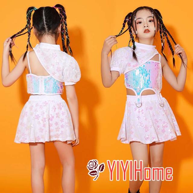 キッズ 子供用 ダンス 衣装 3点セットアップ スパンコール 衣装 キラキラ ヒップホップ ダンス衣装 片袖 トップス ショート丈 へそだし 女の子 おしゃれ ダンス衣装 HIPHOP インナーパンツ付きスカート レディース ジュニア 大きいサイズ 110cm-180cm