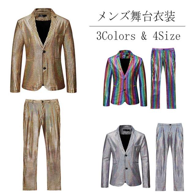 ステージ衣装 メンズ ジャケット ズボン セット 男性 忘年会 新年会 発表会 ハロウィン コスプレ ダンス衣装 ジャケット ステージ衣装 舞台衣装 カラオケ衣装 ステージスーツセットアップ 礼服 ゴールド マルチカラー シルバー 司会 団体 マジック用 スパンコール