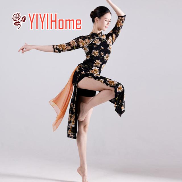 レディース古典舞踊ダンス衣装 花柄 チャイナ風ダンスウェア 飄逸 中国風古典ダンス 衣装セット 大人 中華 クラシカル ダンス練習着 レッスン着 大人用 カンフー衣装 団体 お揃い 半袖 ワンピース ブラック スカーフ付き