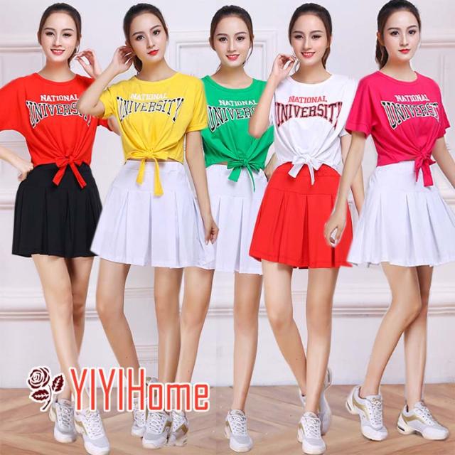 ダンス衣装 チアダンス レディース チア チアリーダー 舞台衣装 ダンスウェア 韓国風 応援団 セットアップ トップス 半袖 プリーツスカート 体操服 お揃い へそ出し ライブ衣装 コンサート 発表会 イベント スクールガール 仮装 学園祭 文化祭 演出服 余興 宴会 2点セット