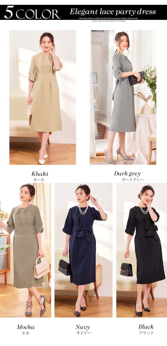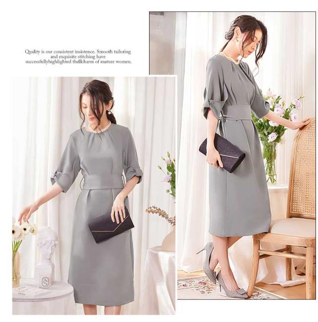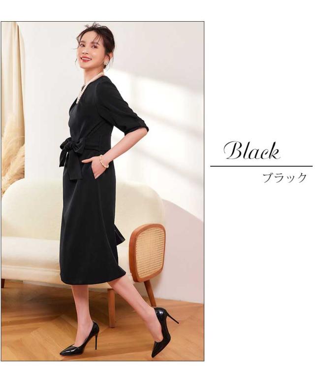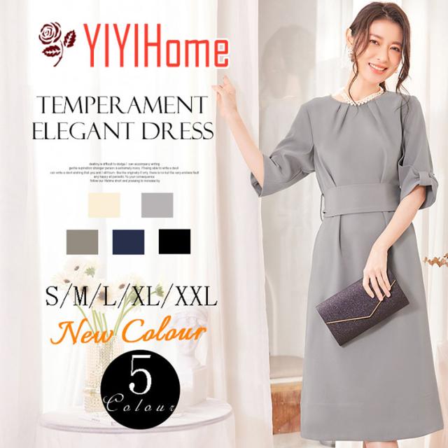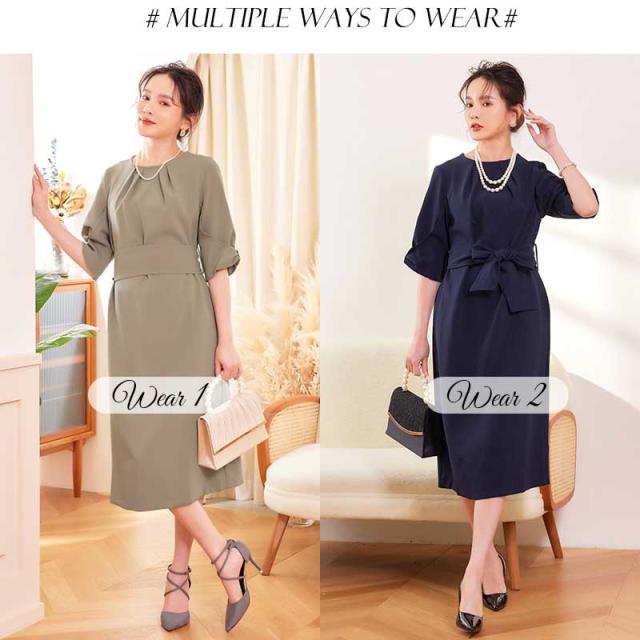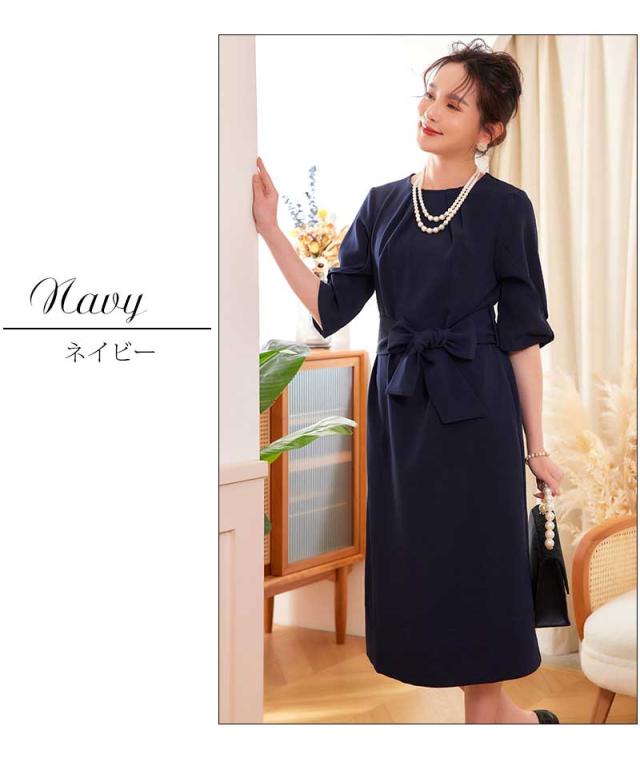 シーンを選ばずに着られるコクーンワンピースドレス パーティードレス フォーマルドレス ドレス ワンピース コクーン レディース 五分袖 ミモレ丈 裏地なし ベルト付き 体型カバー リボン卒業式 入学式 入園式 卒園式 フォーマル