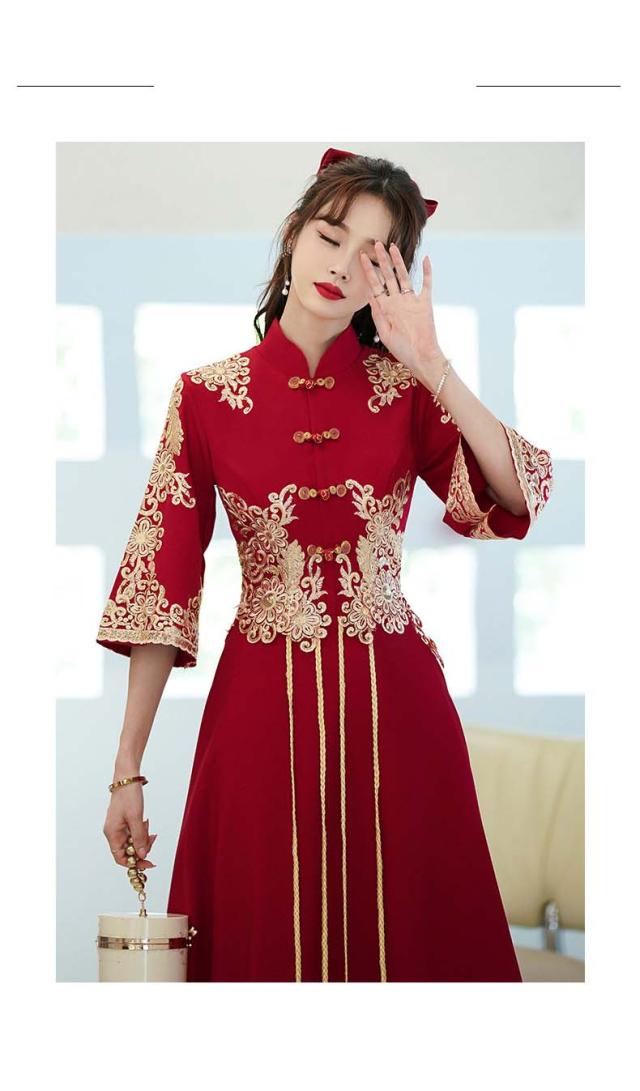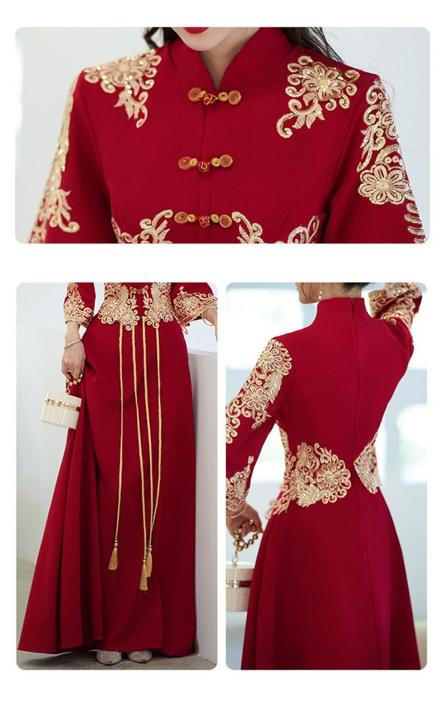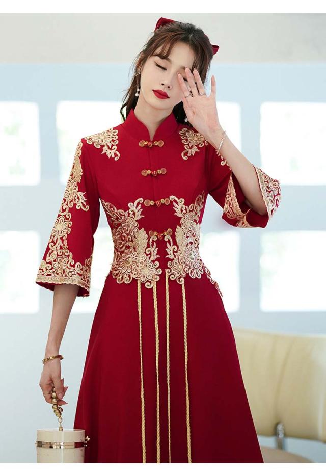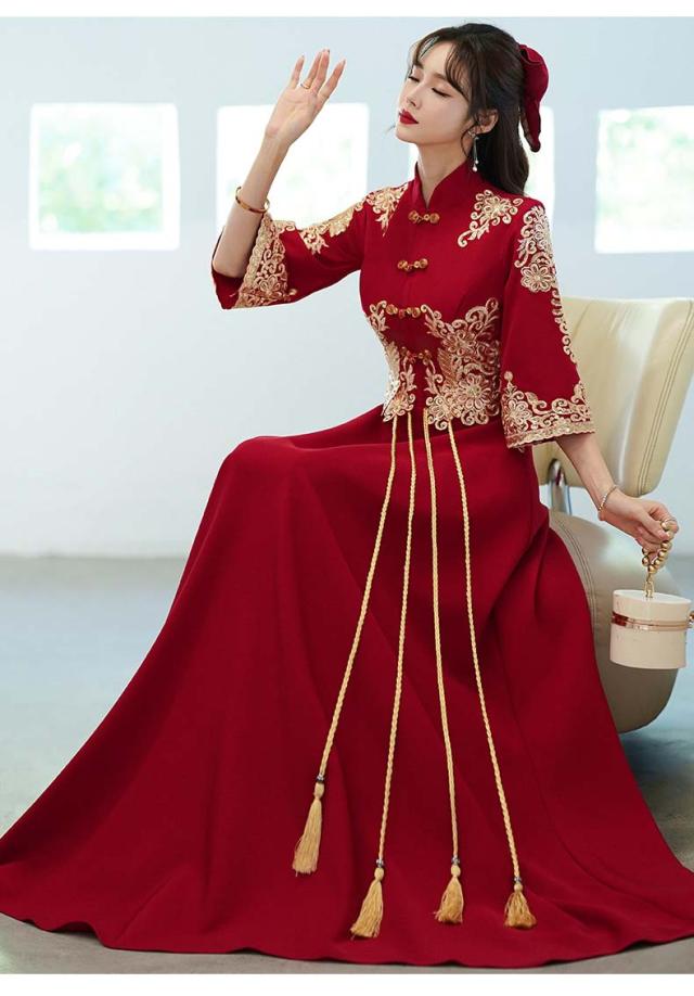 チャイナドレス ロング丈 マキシ丈 チャイナ ドレス 中国風結婚式 花嫁ドレス 七分袖 改良中華ドレス ワインレッド 金色な刺繍 中国風ウェディングドレス 中華服 チャイナ服 中華 舞台ステージ 衣装 レッド
