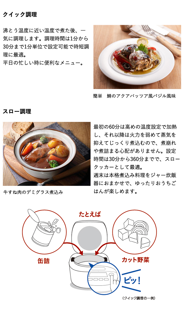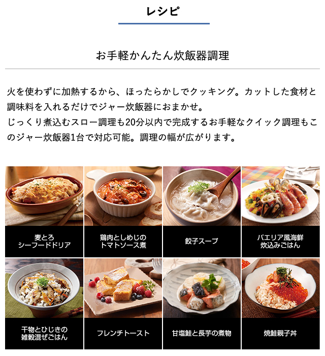 そんなご要望にお応えして豊富な炊飯メニューと便利な調理メニューをご用意しました。