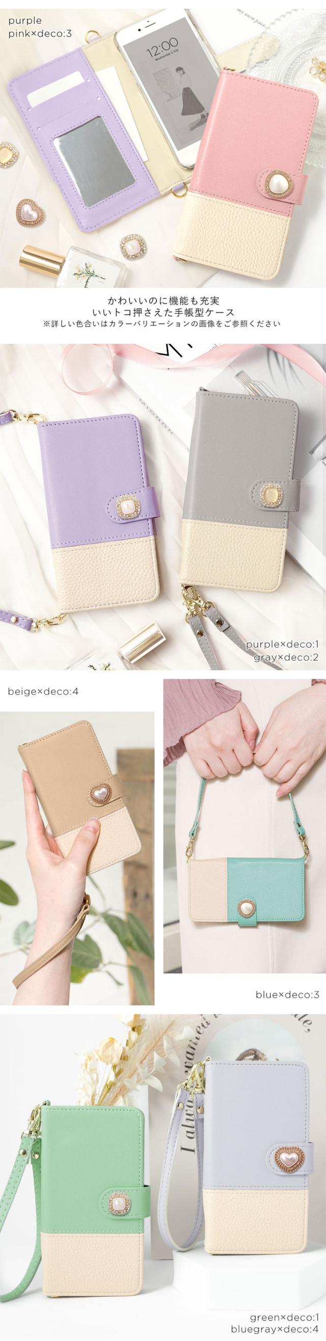 どんなファッションにも合わせやすいニュアンスカラーの手帳型スマホケースが全7色×ワンポイントデコ4種