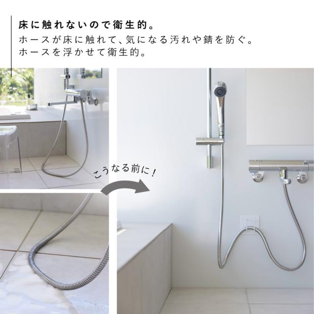 マグネットで簡単取り付け。シャワーホースを浮かせて衛生的なホースフック。ホースが床に触れて、気になる汚れや錆を防ぐ便利なアイテム。ホースを浮かせて衛生的。