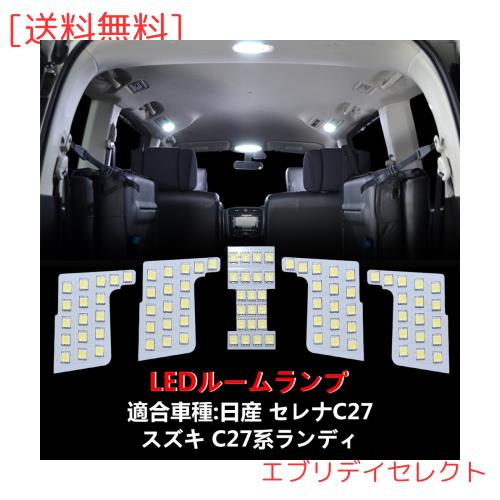 製品情報:LED ルームランプ 【適合車種】:日産 セレナC27 H28.9〜 全グレード、スズキ ランディ SGC27 SGN27 H28.12〜 全グレード【発光カラー】:ホワイト 6000K。【セット内容】:フロントランプ×2、センターランプ×2、ラゲッジランプ×1、全5点。