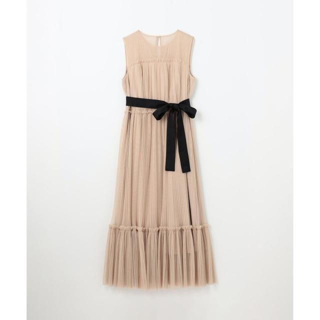 やや光沢のある2種類のチュール素材を使用し、端正なプリーツ加工を入れたチュールドレス。しっかりと裏地を付けた、そのまま一枚で華やかに着られる一枚です。 非常に目が細かいチュールを使用して、それをさらに細かくプリーツ加工をかけて仕上げた美しい佇まい。繊細なプリーツの表情や2種類のチュールの陰影がとても美しく、動いた時の綺麗なシアー感が目を引きます。 ウエストには光沢のあるサテンリボンを付けて、女性らしいフィットアンドフレアシルエットを表現しました。一枚で着た時にも華やかに着映えますが、リボンを外して上からニットカーディガンを羽織ったりと、少しカジュアルダウンした着こなしも楽しむことができます。