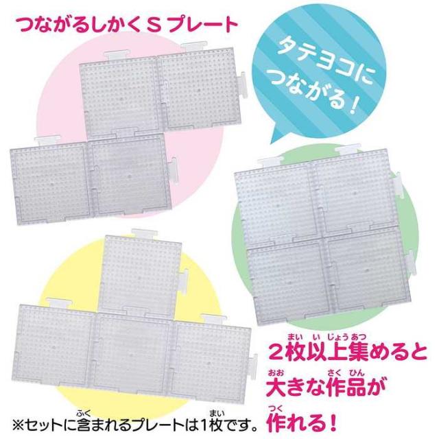 セットに入っている「とうめいプレート(つながるしかく S)」は、通常の「四角形S」よりも一回り大きく、プレートどうしをつなげることも出来るのでプレートを集めて大きな作品を作れます。パーラービーズオフィシャルサイトには「とうめいプレート(つながるしかく S)」を使った図案が掲載されています。