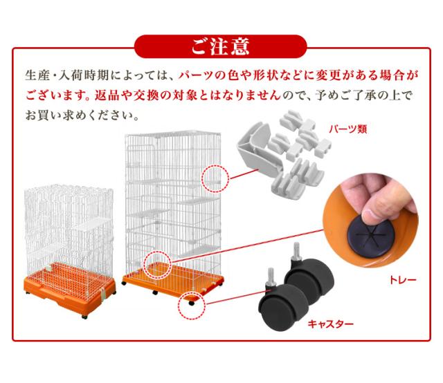 | 注意事項 | ・組み立て式(未完成品)です。 ・ペットの予期せぬ行動から発生したケガや事故・破損に対する保障は致しかねます。 ・表示されている耐荷重以上では絶対に使用しないでください。商品が破損したり、ケガをする恐れがあります。 ・生後間もない幼猫にご使用の場合、フェンスの隙間から頭や体が出る恐れがありますので注意してください。 ・写真と実物は多少異なる場合がございます。あらかじめご了承下さい。 ・商品は、モニターによって色合いが異なって見える場合があります。 ・仕様・デザインは改良のため予告なく変更することがあります。 |