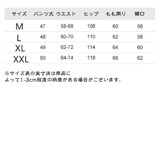 | サイズについての説明 | サイズ パンツ丈 ウエスト ヒップ もも周り 裾幅 ※サイズ表の実寸法は商品によって1-3cm程度の誤差がある場合がございます。 |