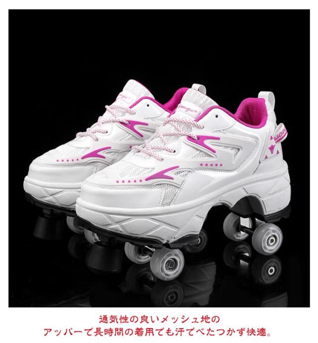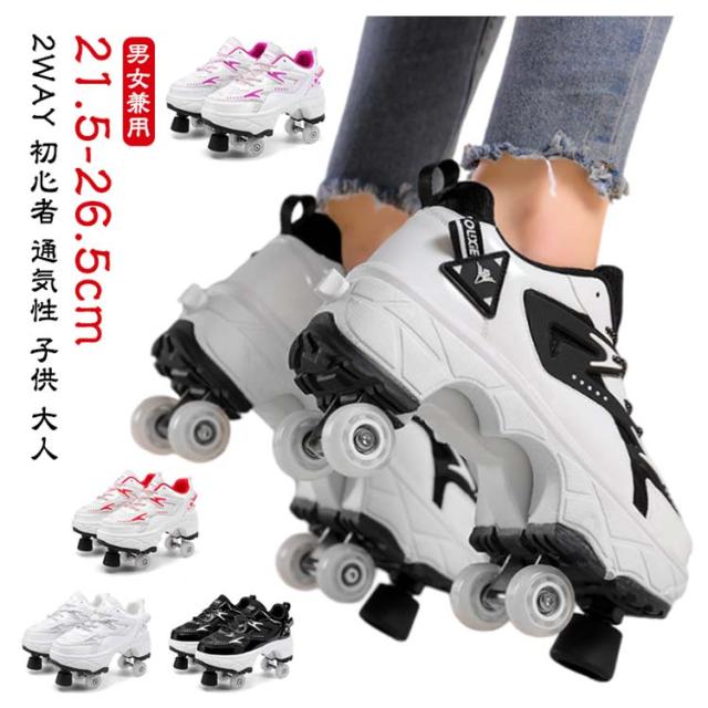 おしゃれ ローラーシューズ メッシュ ワンボタン 4輪 ローラースケート 配色 スニーカー ワンボタン ローラーシューズ キッズ 大人 レディース メンズ 靴 学生 子ども 運動靴 スポーツ ローラースニーカー シューズ 輪収納できる 2WAY 初心者 通気性 白 黒 子供