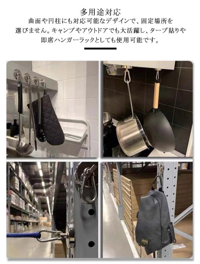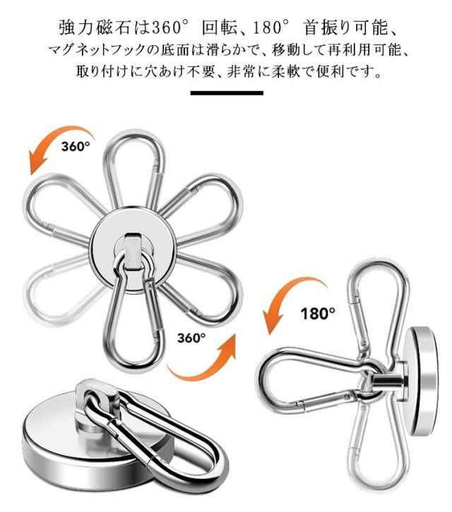 | 超強力なネオジムを使用し、どんな重い荷物も安心して掛けられます。 キッチン、オフィス、倉庫、ガレージなど、様々な場所で活躍します。 多用途対応 曲面や円柱にも対応可能なデザインで、固定場所を選びません。 キャンプやアウトドアでも大活躍し、 タープ貼りや即席ハンガーラックとしても使用可能です。 便利なカラビナ付き カラビナ形状で、簡単に取り付け・取り外しができます。持ち運びも簡単で、 旅行やキャンプにも最適です。 強力は360°回転、180°首振り可能、マグネットフックの底面は滑らかで、 移動して再利用可能、取り付けに穴あけ不要、非常に柔軟で便利です。 高い耐久性 耐久性に優れた素材を使用し、長期間使用しても劣化しにくい設計。 どんな環境でも安心してお使いいただけます。 | |