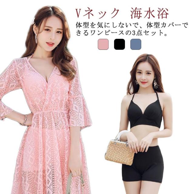 マタニティ ワンピース 半袖 3点セット 海水浴 Vネック レース かわいい 水着 花柄 大きいサイズ 夏 おしゃれ 安い 妊婦服 フラワー 体型カバー 産後兼用 プール